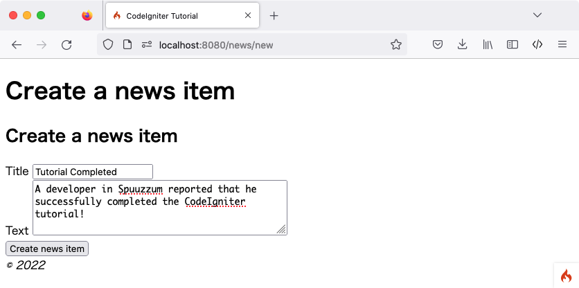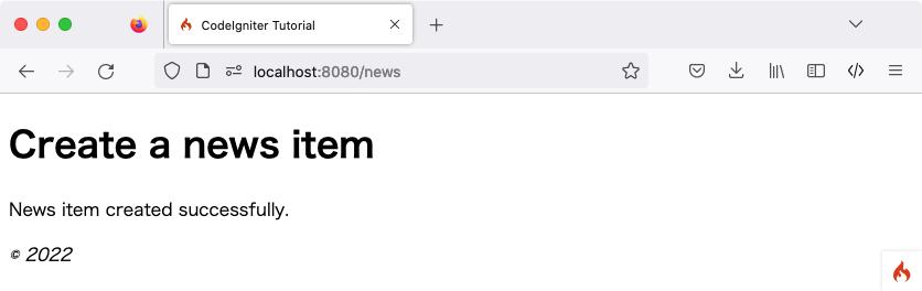 现在将您的浏览器指向您安装 CodeIgniter 的本地开发环境,并在 URL 中添加 ** /news/new **。添加一些新闻并查看您创建的不同页面。
